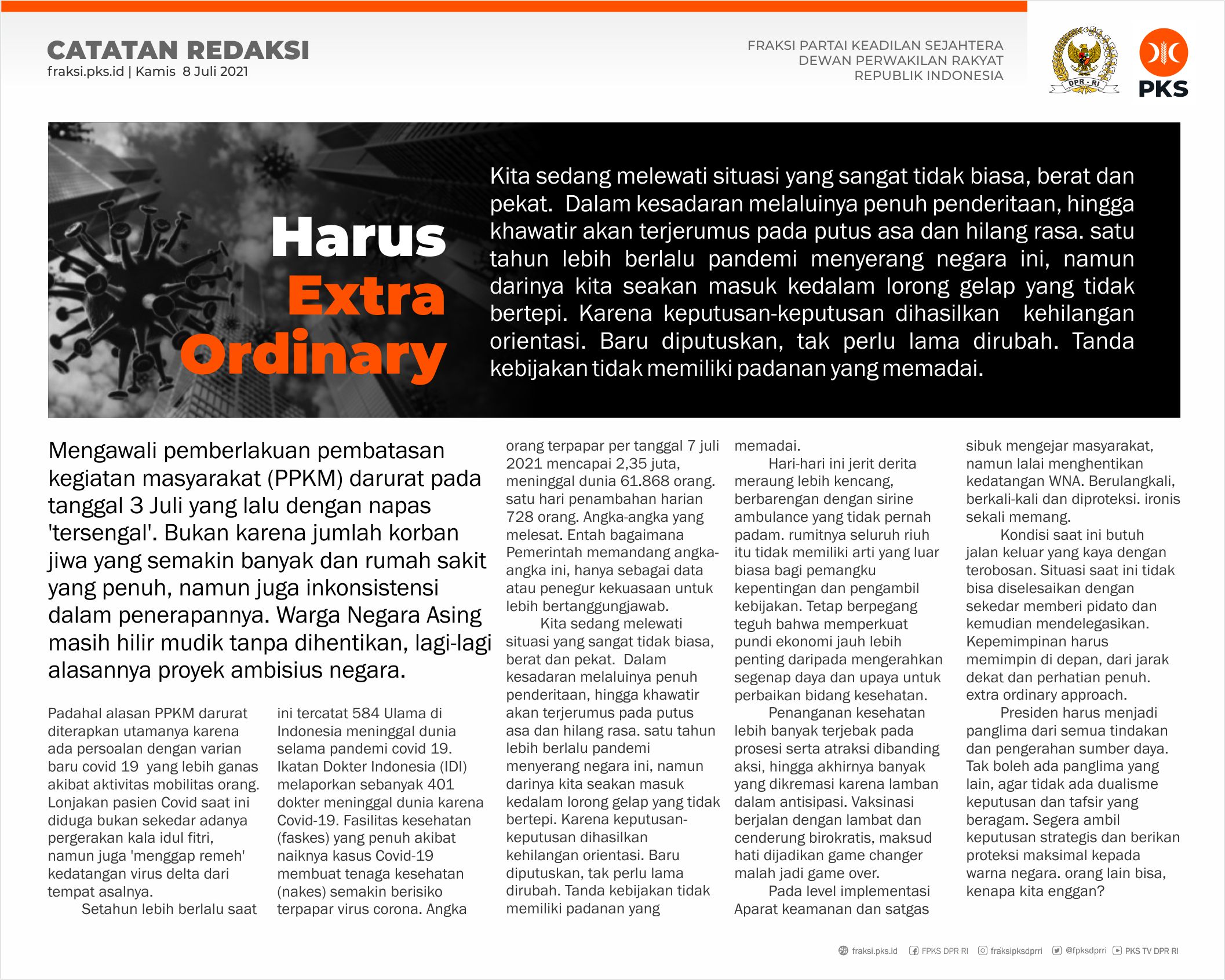Fraksi PKS DPR RI berkomitmen memperjuangkan kepentingan rakyat. Ketahui positioning, kebijakan dan isu PKS di Parlemen kami hantarkan e-newsletter PKS Parlemen Edisi I JULI 2O21 No.17