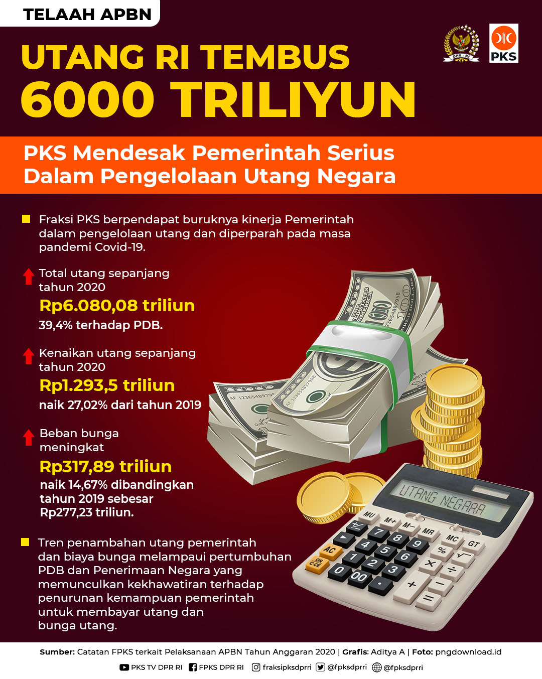Fraksi PKS berpendapat buruknya kinerja Pemerintah dalam pengelolaan utang dan diperparah pada masa pandemi Covid-19. Tercatat total utang Pemerintah pada tahun 2020 mencapai Rp6.080,08 triliun atau 39,4 persen terhadap PDB. Kenaikan utang sepanjang tahun 2020 sebesar Rp1.293,5 triliun atau 27,02 persen dari tahun sebelumnya. Tingginya utang juga diiringi dengan melonjaknya beban bunga yang dibayarkan pada tahun 2020 sebesar Rp317,89 triliun, meningkat Rp14,67 persen dibandingkan tahun 2019 sebesar Rp277,23 triliun.