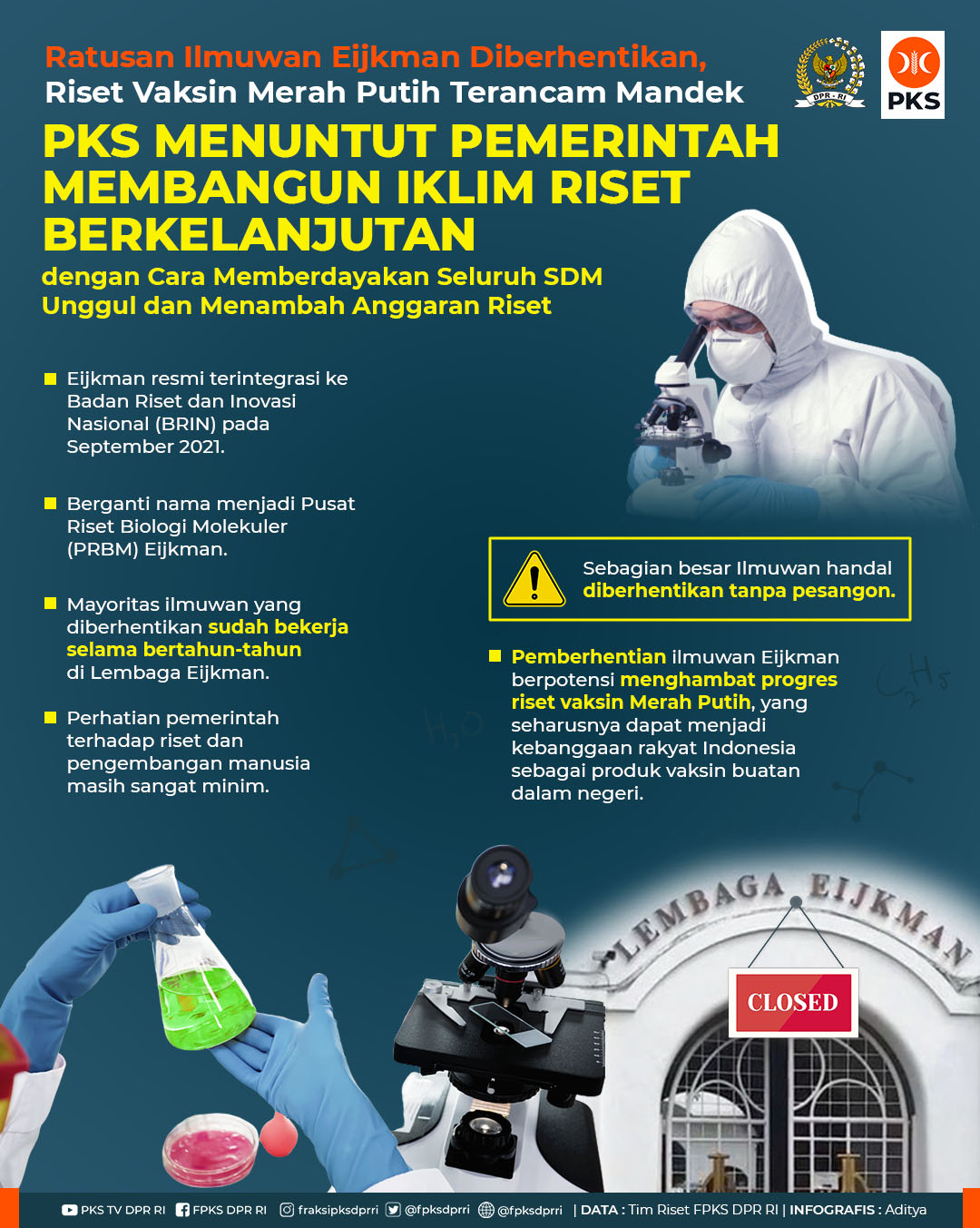 Fraksi PKS senantiasa mengingatkan Pemerintah untuk membangun iklim riset berkelanjutan dengan cara memberdayakan seluruh SDM unggul dan menambah anggaran riset. Namun, pemberhentian terhadap sejumlah ilmuwan Eijkman tampaknya menunjukkan situasi yang sebaliknya.