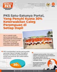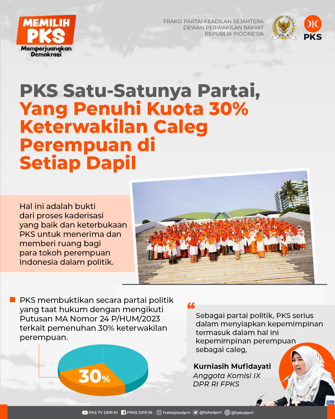 Selain itu, PKS membuktikan secara partai politik yang taat hukum dengan mengikuti Putusan MA Nomor 24 P/HUM/2023 terkait pemenuhan 30% keterwakilan perempuan.