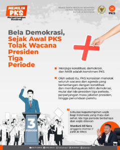 Menjaga konstitusi, demokrasi, dan NKRI adalah komitmen PKS. Oleh sebab itu, PKS konsisten menolak seluruh wacana dan agenda yang bertentangan dengan konstitusi dan membahayakan iklim demokrasi, mulai dari ide presiden tiga periode, perpanjangan masa jabatan presiden, hingga penundaan pemilu.
