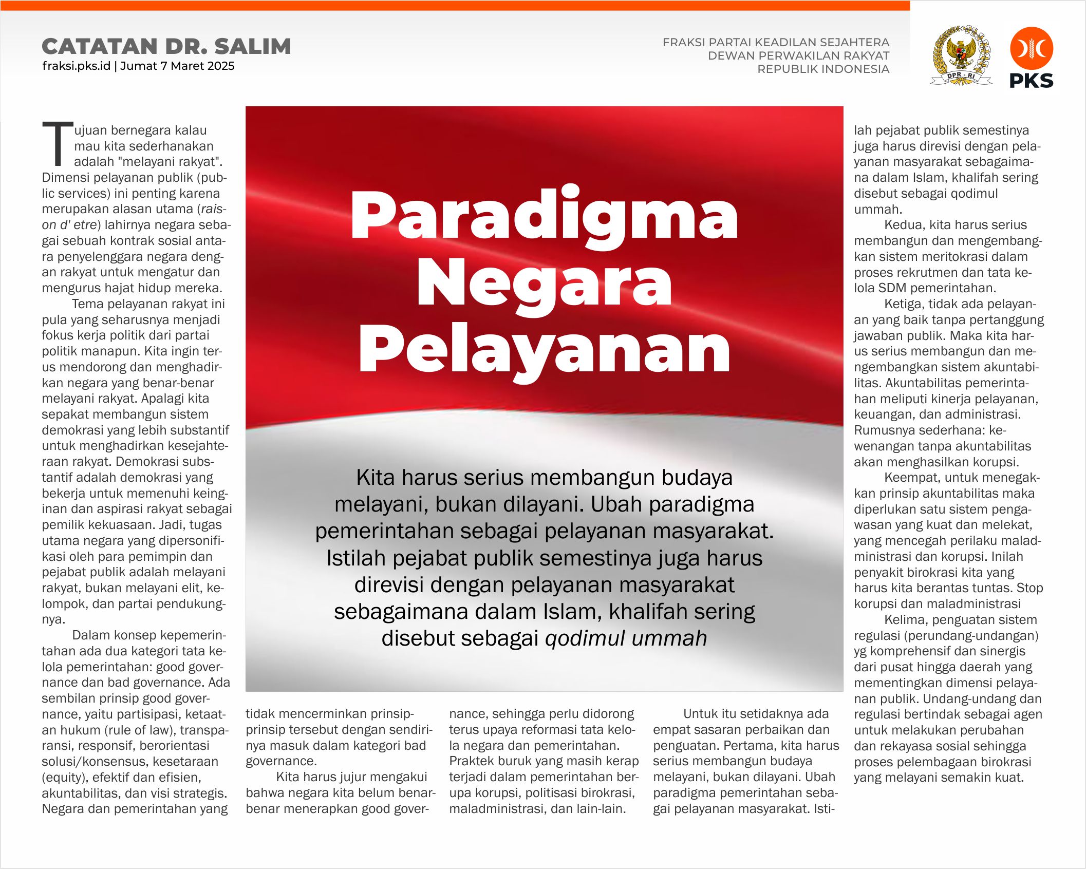 Kepada rekan dan sahabat PKS Tetap semangat, Sehat dan Bahagia Izinkan kami menyampaikan kabar terkini PKS dari Parlemen di Senayan dalam e-newsletter PKSParlemen edisi Maret I 2025 No. 56. Temukan positioning, informasi dan kebijakan PKS terkait sejumlah isu. Silahkan share dan sampaikan untuk mewujudkan Indonesia yang lebih baik.