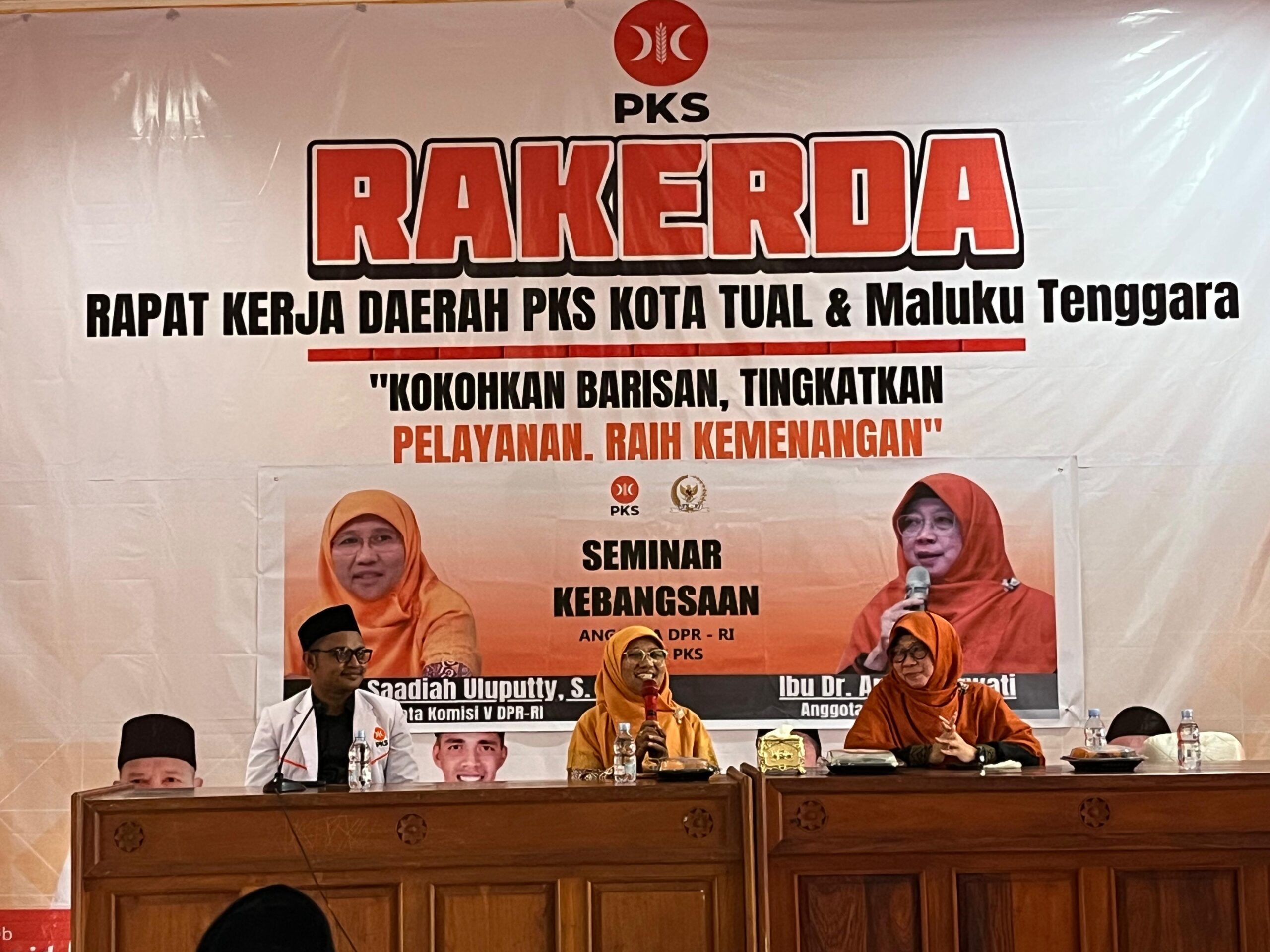 Tual (04/01) — Anggota DPR RI Fraksi PKS Dapil Maluku, Saadiah Uluputty, menghadiri sekaligus menjadi narasumber dalam Seminar Kebangsaan yang digelar di Kota Tual, bersamaan dengan pelaksanaan Rapat Kerja Daerah (Rakerda) PKS Maluku Tenggara. Kegiatan ini juga menghadirkan Anis Byarwati, Anggota DPR RI Fraksi PKS Komisi XI, sebagai narasumber nasional. Seminar ini menjadi ruang strategis untuk memperkuat pemahaman kebangsaan sekaligus meneguhkan peran masyarakat dalam menjaga persatuan dan keadilan sosial, Sabtu, 3 Januari 2026.