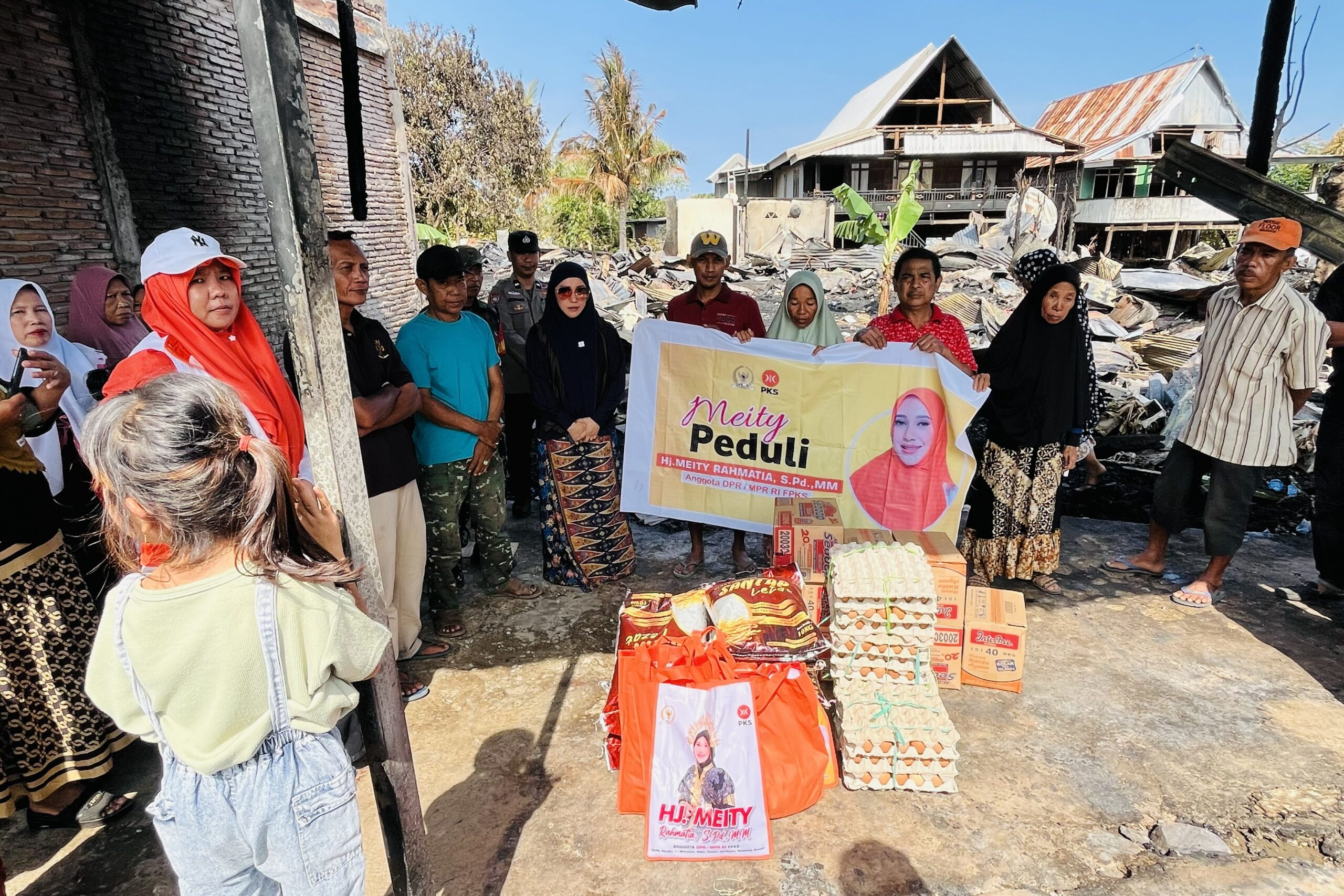 Selain sebagai bentuk dukungan moril, dalam kunjungannya ini Meity beserta rombongan juga menyerahkan berbagai bantuan dalam bentuk sembako dan materi untuk kebutuhan dasar bagi warga yang sedang tertimpa musibah.